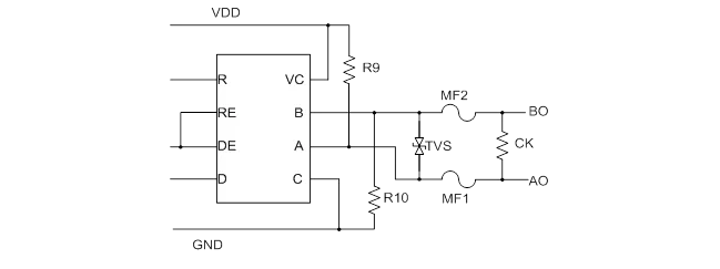 3,AB端口分別并聯(lián)熱敏電阻、TVS 到地,同時(shí)A,B之間并聯(lián)TVS器件的保護(hù)方案。